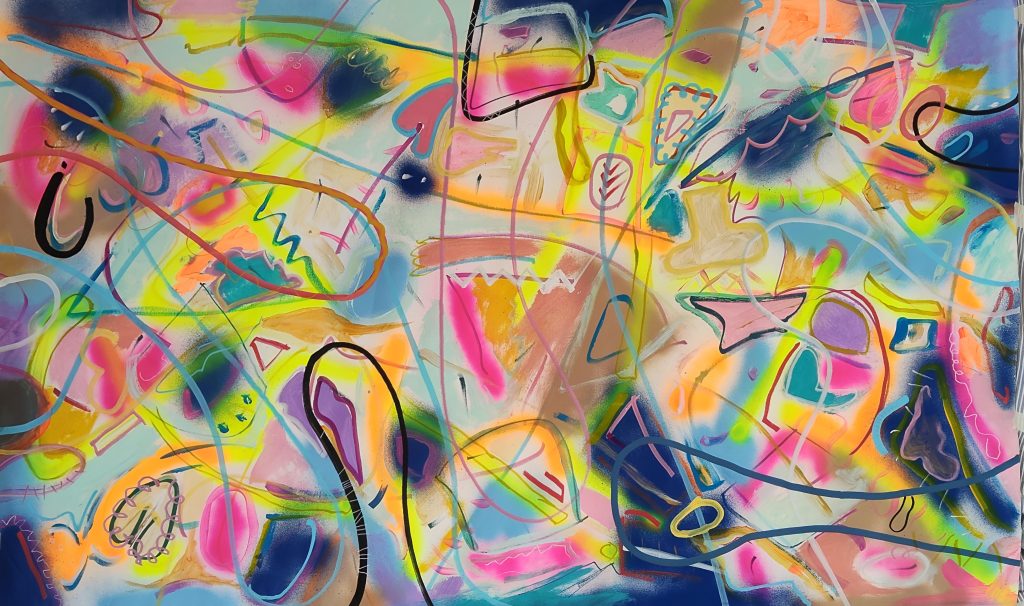 Acrylic, spray, inks, markers on cotton canvas. 2025
